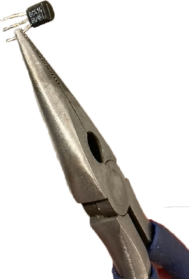 Ein Hinweis noch zum Löten der Transistoranschlüsse: Transistoren sind sehr wärmeempfindlich, das Löten sollte daher nur sehr kurzzeitig erfolgen. Bei sehr kurzen Anschlussdrähten empfiehlt sich der Einsatz einer kleinen Flachzange zur Wärmeableitung. Damit wird das jeweilige Beinchen des Transistors eingeklemmt. Die relativ große Masse der Zange leitet die Wärme ab, bevor diese in den Transistor gelangt.