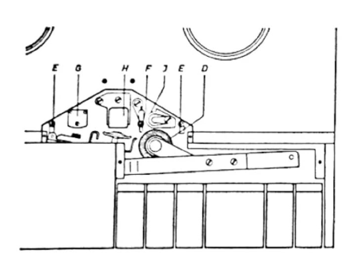 Zur Reinigung entfernen Sie bitte die Abdeckplatte (A) unmittelbar hinter den Drucktasten und die trapezförmige Kappe (B) (siehe Abbildung). Andruckrolle (D), Bandführungen (E, F) und Tonköpfe (G, H) werden dann leicht zugänglich und können mit einem spiritusgetränkten Lappen, der am besten über ein Holzstäbchen gezogen wird, gereinigt werden. Auch die Tonwelle (J) ist von möglicherweise anhaftenden Staub- oder Schichtteilchen zu reinigen.