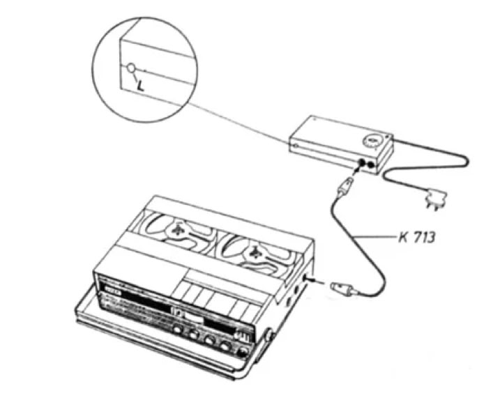 Das Netz- und Ladegerät kann über die Verbindungskabel Typ K713 bzw. K714 mit dem Tonbandgerät verbunden werden. Der Anschluss erfolgt an der seitlichen mit A gekennzeichneten Buchse. Etwa eingesetzte Trockenbatterien (Monozellen) werden automatisch abgeschaltet. Sie können aber auch das Netzgerät im Batteriefach unterbringen. Hierzu nehmen Sie den Boden des Tonbandgerätes ab und setzten das Netzgerät so in das Batteriefach, dass die beschriftete Seite nach oben kommt und das Netzkabel gerade durch den Ausschnitt am Boden herausgeführt werden kann.