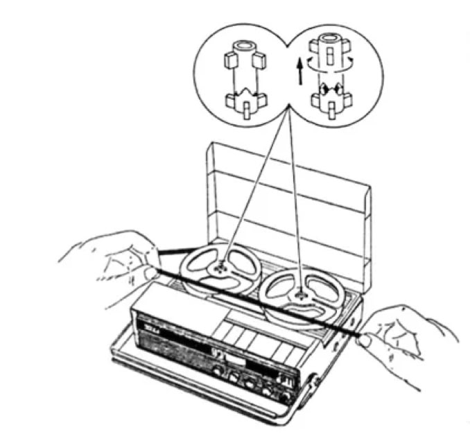 Bei transportablen Geräten ist es notwendig, die Bandspulen gegen Herabfallen zu sichern. Ehe Sie das Tonband einlegen, ziehen Sie bitte die beiden Dreizackdome der Spulenteller nach oben und drehen
