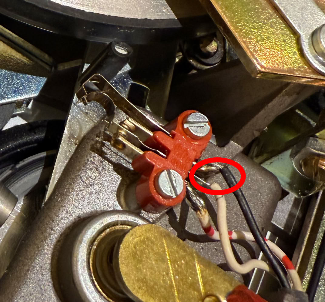 Kontrolle: Band starten und beim Mikroschalter die oberen Kontakte (rote Umrandung auf folgendem Foto) mit einem kleinen Schraubendreher überbrücken.