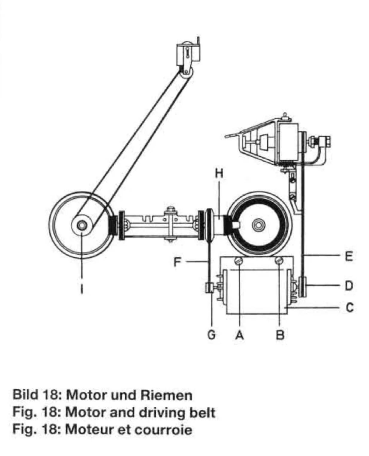 Der elektronisch geregelte Motor (A) treibt über den Riemen (B) die Schwungmasse (C) an. Die Schwungmasse ist entsprechend der Bandgeschwindigkeit mit vier Stufen versehen und schwenkbar gelagert. Sie dreht sich bei allen Bandgeschwindigkeiten gleich schnell.