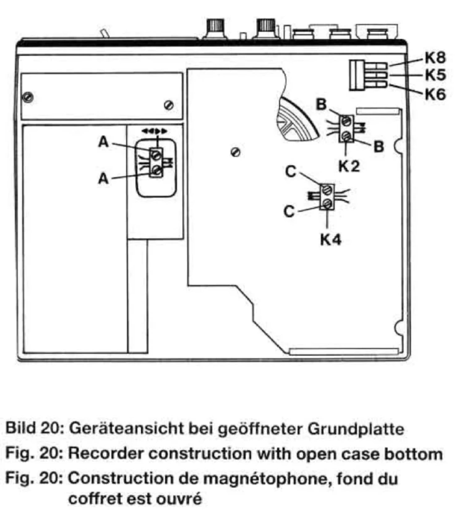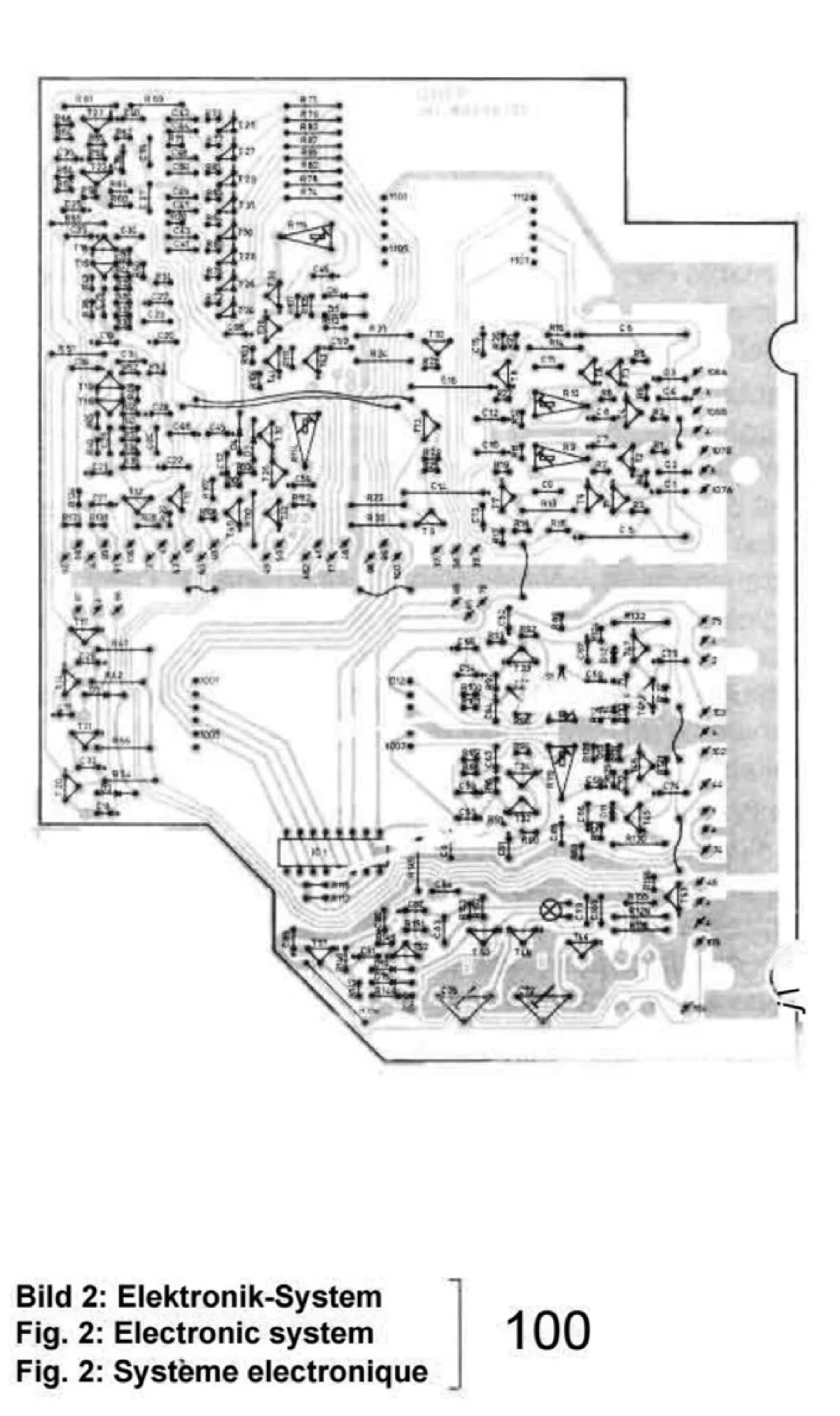 Zwei weitere Leiterplatten sind durch Direktsteckung mit der Grundplatte verbunden: Die Leiterplatte mit Kennziffer 1100, die mit den Bandgeschwindigkeiten umschaltbar nach der in NARTB-Norm aufgelösten Wiedergabe- Entzerrung, sowie die Leiterplatte mit Kennziffer 1000 für die umschaltbare Aufnahme-Entzerrung. Nach Lösen der Befestigungsschraube auf der Widerlagerschiene für das Antriebsrad, kann die ganze Einheit ausgeschwenkt werden und bleibt dabei voll funktionsfähig.