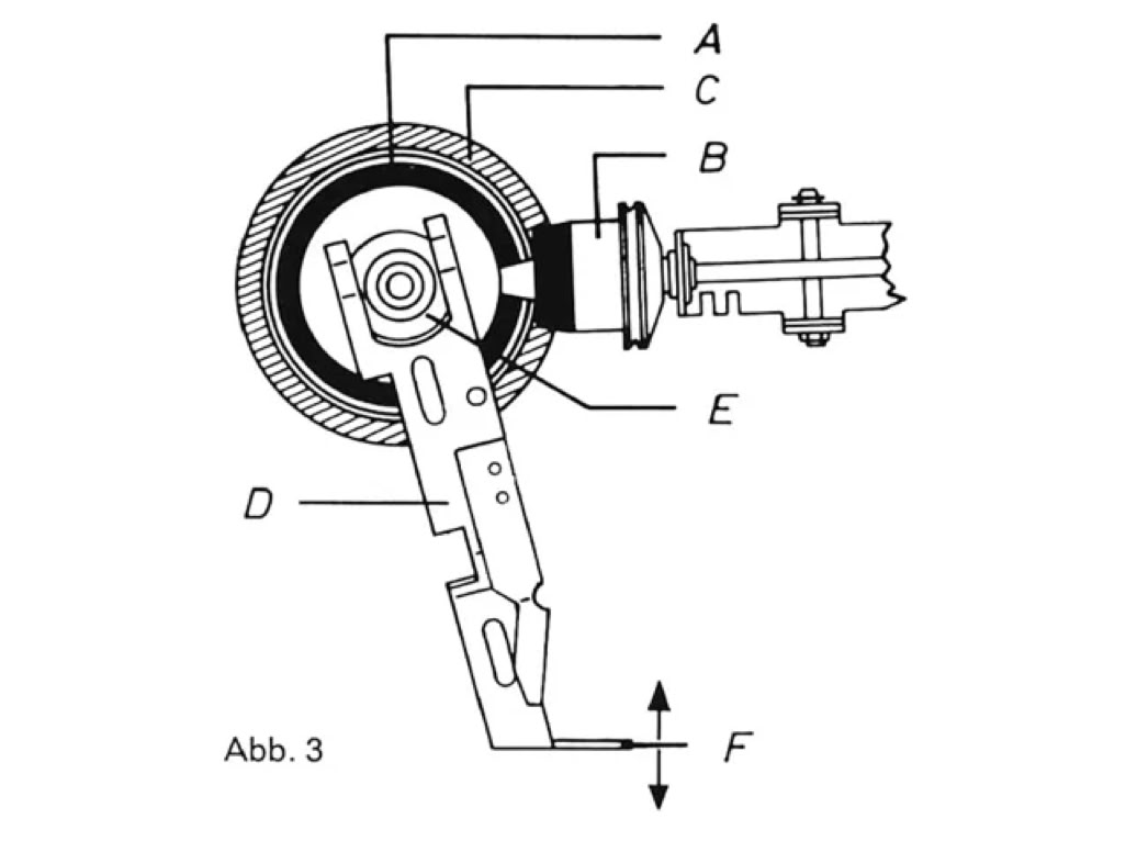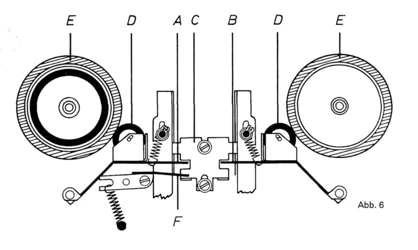 Bei gedrückter Starttaste wird über den Steuerschieber (D) und den Kupplungshebering (E) der ursprünglich zurückgedrückte Antriebsteller (A) freigegeben und durch die Kupplungsfedern gegen den kleinen Kegel des Friktionsrades (B) gedrückt. Durch Biegen der Nase (F) des Steuerschiebers (D) in Pfeilrichtung kann die Friktion zwischen Antriebsteller (A) und dem Kegel des Friktionsrades (B) eingestellt werden. Nach Lösen der Taste „Start" und Drücken der Taste „Vorlauf" darf keine Friktion zwischen Antriebsteller (A) und dem Kegel des Friktionsrades (B) bestehen. Es muß mindestens ein Abstand von 0,5 mm vorhanden sein. Die Einstellung der rechten Kupplung ist dann einwandfrei, wenn sie bereits bei zwei Drittel gedrückter Starttaste dreht. Anschließend ist der Stummkontakt K 5 gemäß Abs. 4.22 einzustellen.
