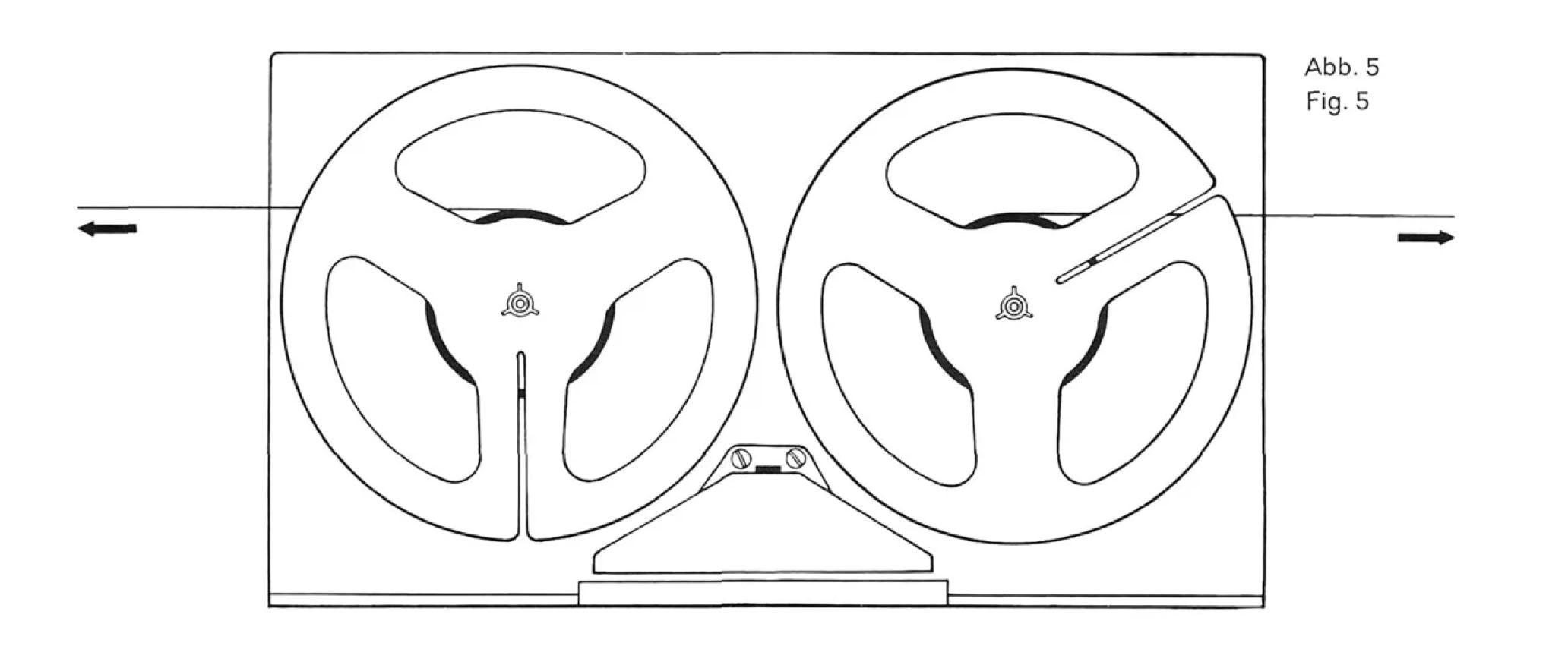 Sämtliche Bandführungselemente müssen senkrecht stehen. Das Tonband muss ohne an den Spulenflanschen zu streifen aufgewickelt werden. Es muss geradlinig (siehe Abb. 10 gestrichelte Linie) durch die Bandführung laufen. Die richtige Höhe des Tonbandes ist bei den verschiedenen Typen wie folgt zu prüfen: