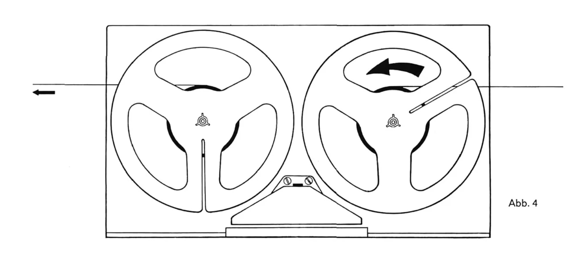 Gerät ausschalten und eine, mit einem ca. 50 cm langen Band bewickelte Bandspule (Kerndurchmesser 45 mm) auflegen. Durch Abziehen in Pfeilrichtung ist zu prüfen, ob die Kupplungsoberteile merklich abgebremst werden. Diese Prüfung ist bei beiden Kupplungen vorzunehmen.