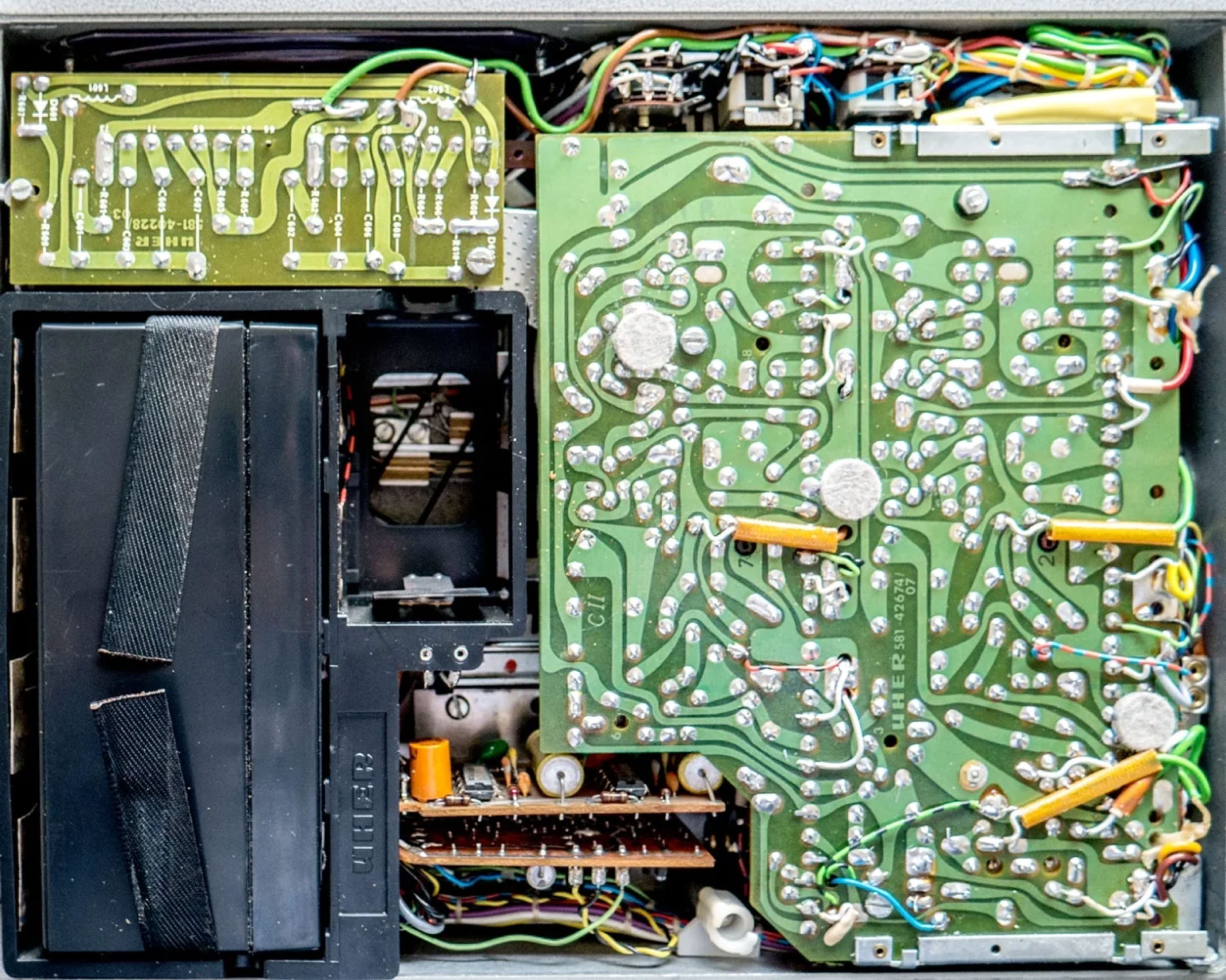 Links oben: Entzerrer-Platine für die verschiedenen Geschwindigkeiten, rechts die große Hauptplatine, in der Mitte unten die NF-Endstufe und darunter die Motorregelung. Alle Bauteile sind Original, über 40 Jahre alt.