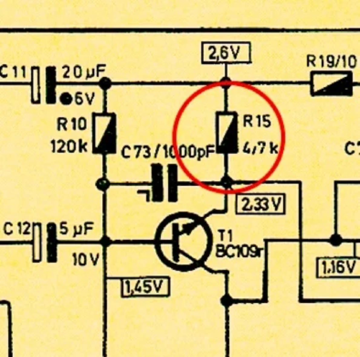 Der Schaltplan half auch nicht mehr weiter. Kontakte konnten es nicht sein, das ist leicht festzustellen. Der Fehler musste an der Vorstufe irgendwo bei T1 und T2 liegen. aber wo? Die Elkos waren in Ordnung, die Transistoren ebenfalls. Also kamen jetzt die Widerstände dran. Nach leichtem (!) Klopfen mit dem Schraubendrehergriff fiel mir der Widerstand R 15 (4,7 kOhm) ins Auge. Der saß so leicht verdreht drin. Also vorsichtig mit dem kleinen Holzspatel dran getupft (kein Metallwerkzeug nehmen!) und siehe da: Der Widerstand teilte sich auf einmal in zwei Hälften. In der Mitte glatt auseinander gebrochen. War vorher nicht zu erkennen! Also schnell einen passenden Widerstand eingelötet und siehe da….BINGO!!!! Alles lief perfekt, auch die Aufnahme.