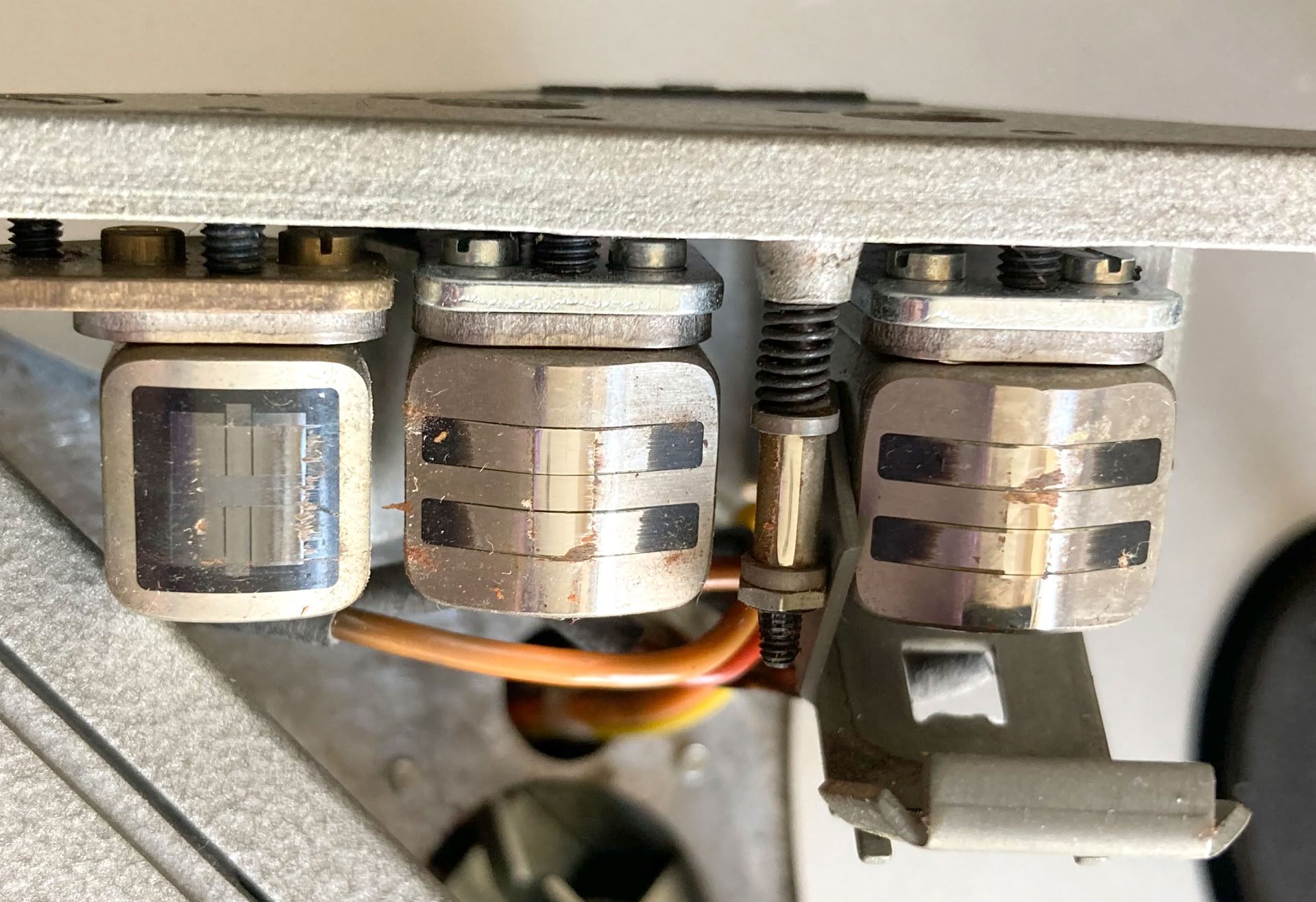 Den Tonköpfen kommt eine überaus wichtige Aufgabe zu. Sie sind sozusagen das Herzstück des gesamten Gerätes. Denn dort werden die Informationen auf das Band „geschrieben“ bzw. „gelesen“. Im Prinzip besteht ein Tonkopf aus einem ringförmigen Magneten, der an der Vorderseite eine winzige Unterbrechung hat, den so genannten Luftspalt. Dies ist die entscheidende Stelle des Tonkopfes, denn dort wird das Band magnetisiert bzw. das bespielte Band eingelesen. Im Internet finden sich zahlreiche Abhandlungen über Details hierzu, ich will daher hier nicht näher auf theoretische Details eingehen.