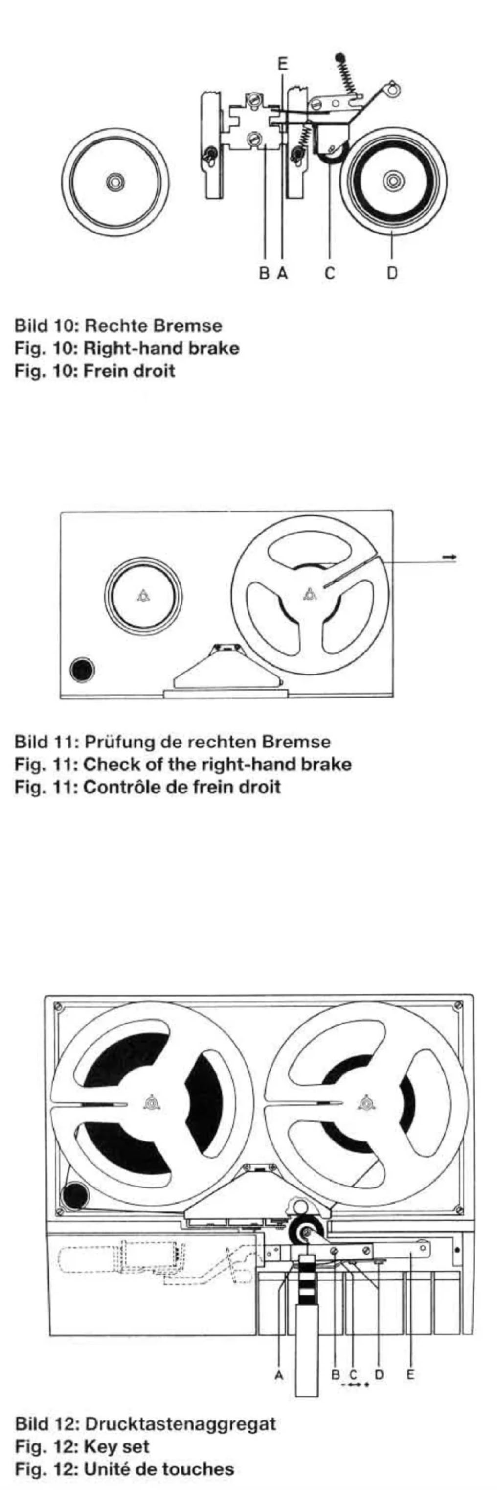 Am Kupplungsoberteil (Q) wird abhängig vom Bandwickel- Durchmesser die Bremsung geregelt und damit der Bandzug konstant gehalten. Dazu dient die Seilzugbremse (R), die ihre Regelinformation von der Führungsrolle (S) über den reibungsarm gelagerten Winkelhebe! (T) bezieht. Mit der Feder (U) wird die Grundbremsung der Kupplung (G) eingestellt. Diese Grundbremsung ist nicht nur in Stellung »Wiedergabe« wirksam, sondern auch in Stellung »Schneller Vorlauf« und sorgt in dieser Betriebsart für einen besonders gleichmäßigen Bandwickel der aufwickelten Kupplung.