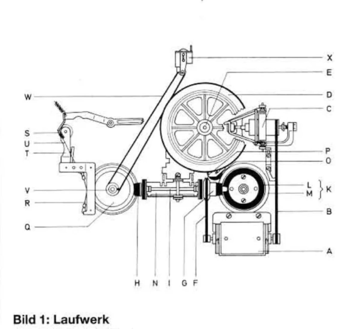 Beim Drücken der Taste »START« wird Friktion zwischen der Schwungmasse (C) und dem Antriebsrad (D) hergestellt. Dadurch erfolgt der Antrieb der Tonwelle (E), die gleichzeitig die Achse des Antriebsrades (D) darstellt. Die Wahl der Bandgeschwindigkeit erfolgt durch Änderung des Übersetzungsverhältnisses zwischen Schwungmasse (C) und Antriebsrad (D). Dabei wird gleichzeitig über eine Nocke die der jeweiligen Bandgeschwindigkeit entsprechenden Entzerrung eingeschaltet. Über den Riemen (F) werden die Friktionsräder (G und H), die durch die Welle (I) miteinander verbunden sind, angetrieben. Diese Friktionsräder sind mit einem kegelförmig geschliffenen Gummibelag versehen.