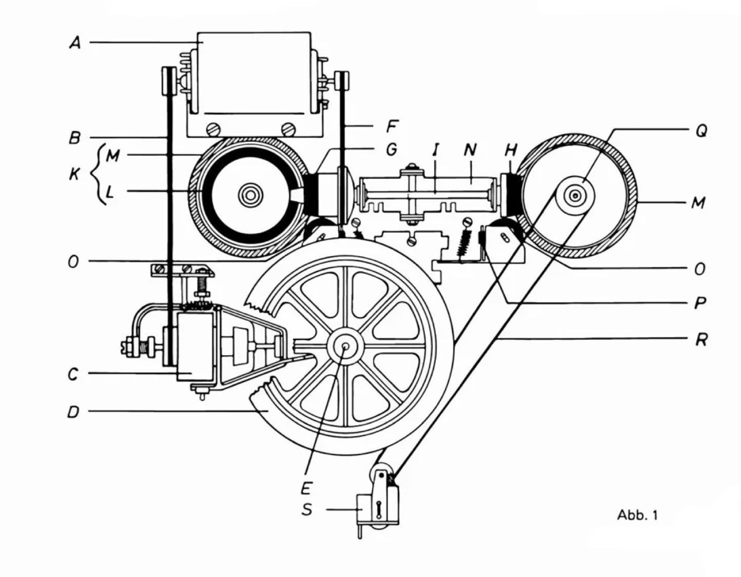 Uber den Riemen (F) werden die Friktionsräder (G) und (H), die durch die Welle (I) miteinander verbunden sind, angetrieben. Die Friktionsräder sind mit einem kegelförmig geschliffenen Gummibelag versehen. Zum Verständnis des Antriebes der Kupplung (K) muß zunächst deren Aufbau erklärt werden. Sie besteht aus dem Antriebsrad (L), einer Kupplungsscheibe mit Filzbelag und dem Kupplungsoberteil (M). in Stellung "Start" gibt ein Schieber das zum Kupplungsoberteil (M) gedrückte Antriebsrad (L) frei, 2 Federn drücken das Antriebsrad (L) gegen den kleinen Kegel des Friktionsrades (G) und die Kupplung (K) wird transportiert.