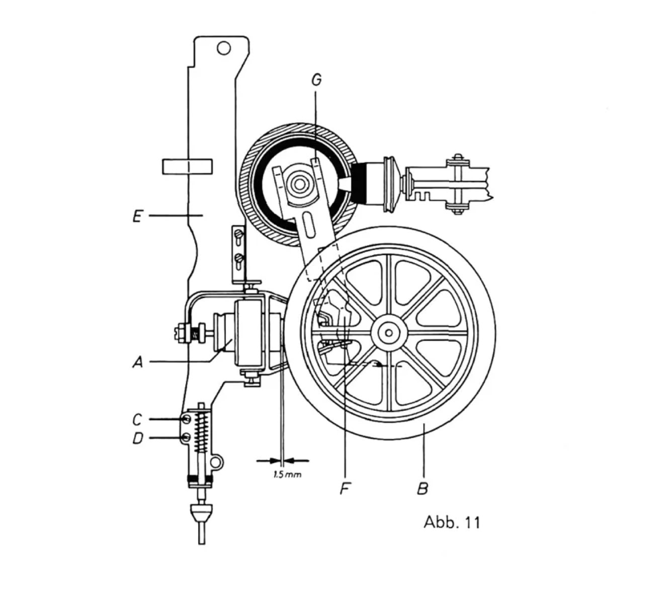Bei gedrückter Starttaste wird über den Steuerschieber (D) und den Kupplungshebering (E) der ursprünglich zurückgedrückte Antriebsteller (A) freigegeben und durch die Kupplungsfedern gegen den kleinen Kegel des Friktionsrades (B) gedrückt. Durch Biegen der Nase (F) des Steuerschiebers (D) in Pfeilrichtung kann die Friktion zwischen Antriebsteller (A) und dem Kegel des Friktionsrades (B) eingestellt werden. Nach Lösen der Taste „Start" und Drücken der Taste „Vorlauf" darf keine Friktion zwischen Antriebsteller (A) und dem Kegel des Friktionsrades (B) bestehen. Es muß mindestens ein Abstand von 0,5 mm vorhanden sein. Die Einstellung der rechten Kupplung ist dann einwandfrei, wenn sie bereits bei zwei Drittel gedrückter Starttaste dreht. Anschließend ist der Stummkontakt K 5 gemäß Abs. 4.22 einzustellen.