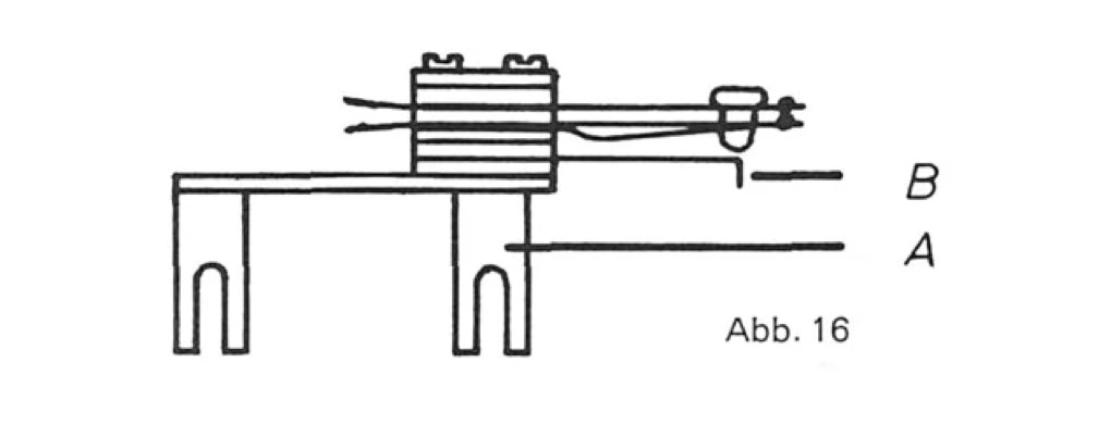 Der Kontakt (rel. a) muß in stromlosem Zustand des Relais geschlossen bleiben. Bei angezogenem Anker des Relais muß er geöffnet sein. Er darf jedoch erst öffnen, wenn der Anker zirka zwei Drittel seines Weges zurückgelegt hat, da sonst die Kraft der Haltewicklung noch nicht ausreicht. Die Einstellung erfolgt durch Biegen des Stützstreifens unter den Kontaktfedern. Der Abstand der Kontaktflächen voneinander soll in geöffnetem Zustand ca. 0,1 mm betragen.